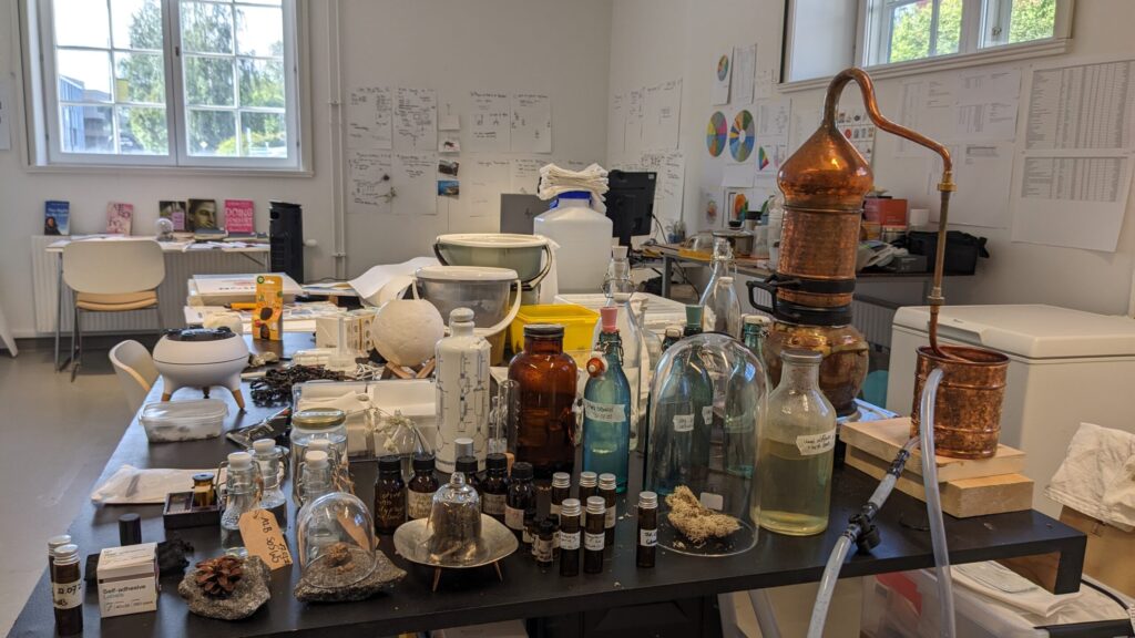 Everyone is welcome to the launch of her project on Friday 15 August, where she will perform a live distillation of Umeå Summer scents. Or drop-in to the Open Studio sessions Saturday 16 to Thursday 21 August 10.00-15.00. You are welcome to contribute to the live distillations, so bring some biomatter that smells of an environment that has significance for you.